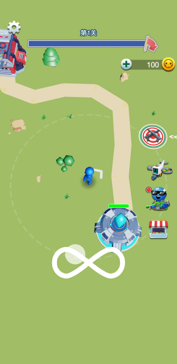 此游戏为休闲塔防类游戏,游戏中你需要防守我方阵地,可以通过移动改变自己的位置,在初始位置不远处有个标记,进入标记待进度加载完成即为开始战斗敌人即将进攻,地上会有金币符号的小圈,进入即可扣除金币建造炮台,再次进入可以升级炮台,后面关卡还会多个方向同时出现敌人,一定要先建造好炮台再开始战斗。