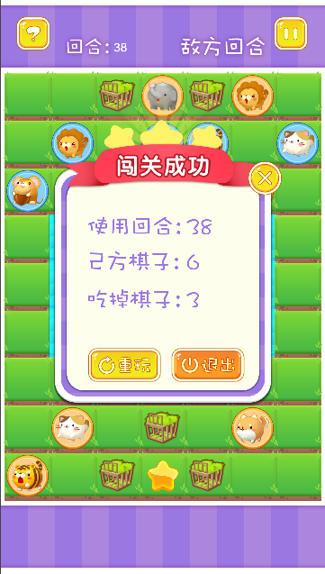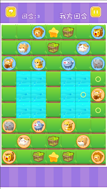 此为人机对战游戏,双方有相同的动物,自己可以随便选择动物进攻,要根据帮助给出的食物链顺序来消灭对方动物哦,不然可能会失败呢,谁先占领对方中心点即为胜利。