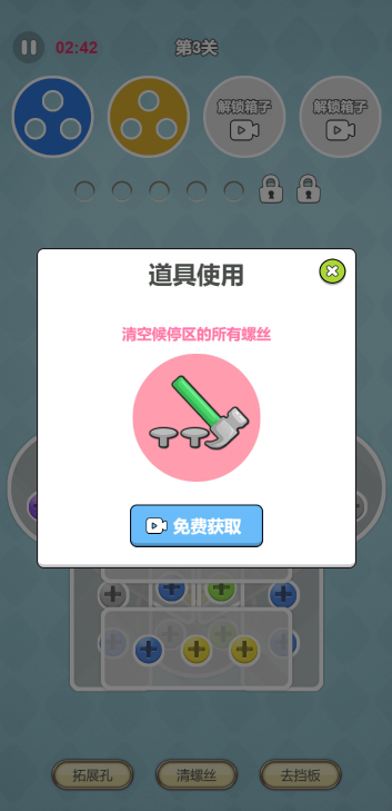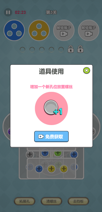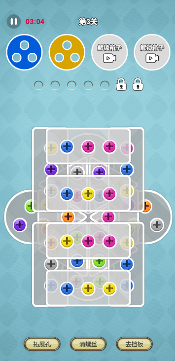 此游戏为休闲类游戏,游戏玩法很简单,根据提供不同颜色盘子来解锁螺丝,如果没有对应颜色的螺丝则可以暂放空白的孔存放,如果遇到难度则可以使用道具加速当前关卡的完成,只有当前关卡完成才能进入下一关,难度会越来越高。