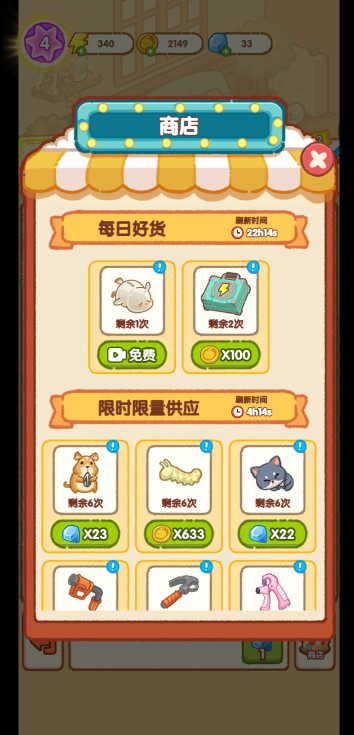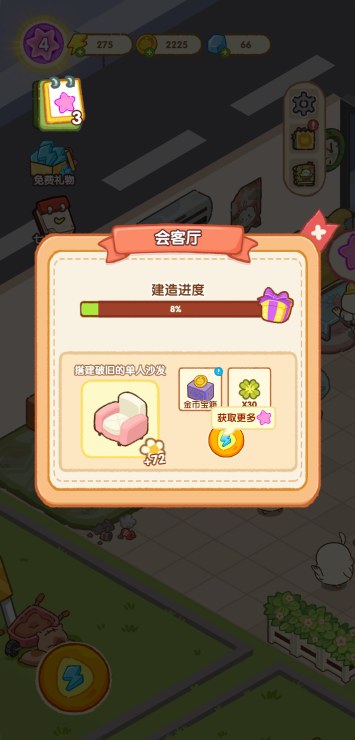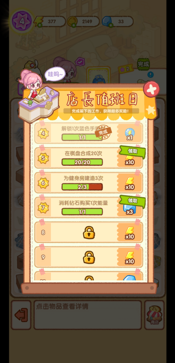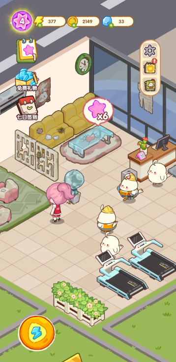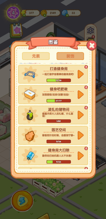 此游戏为休闲养成类游戏,游戏中你需要通过合成来完成指定的任务获取星星,每个健身器材都需要不同数量的星星才能解锁。合成时也要注意被锁住的物品,尽量优先借宿所他们进行合成才有更多空间来容纳更多道具。