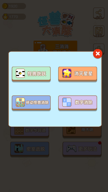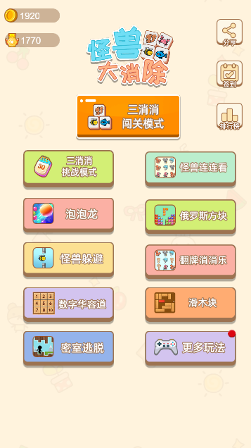 此为单机、休闲类小游戏,该游戏为合集,由14种小游戏合成:三消闯关和挑战模式、连连看、泡泡龙、俄罗斯方块、怪兽躲避、翻牌消消乐、数字华容道、滑木块、密室逃脱、消灭星星等,多种玩法等你来挑战!