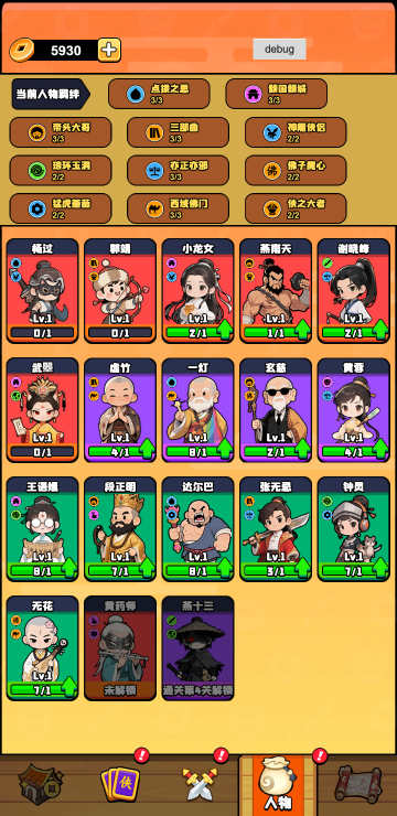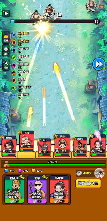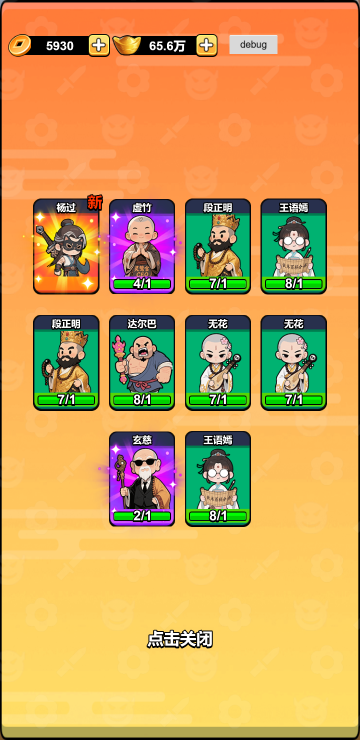 此游戏为休闲塔防类游戏,游戏中你可以招募获取侠客,并且通过升级提升他们的实力,战斗中可以通过消灭敌人获取铜币来刷新侠客和解锁战斗位,选择合适的侠客加入战斗,注意有羁绊加成的侠客会大幅度增加属性值,还可以通过选择不同的属性加成来提升团队实力。
