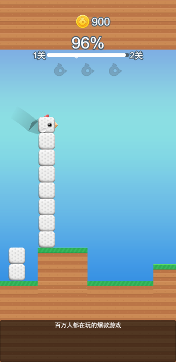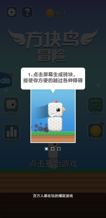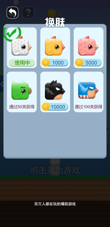 点击屏幕可以增加方块来提升鸟的高度,跨过障碍或者道具会消耗一定数量的方块,如果可以顺利到达终点即为游戏胜利,还有不同皮肤可以更换哦。