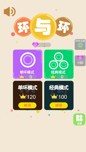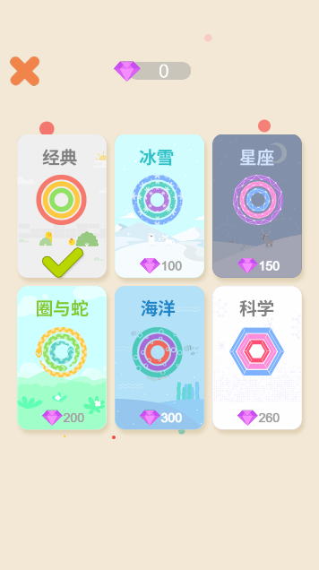 此为单机、休闲类小游戏,游戏内容为使用系统随机生成不同颜色的环,在九宫格内放置,具有同一种颜色的横、竖、斜就可以消除,可以使用钻石购买不同的风格哦。