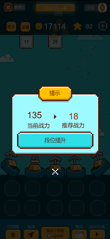 通过合成高级大炮来消灭不断下落的数字,等级越高的大炮奖励的金币越多,段位越高难度越大,可以通过观看视频来开启自动合成和提升攻速。