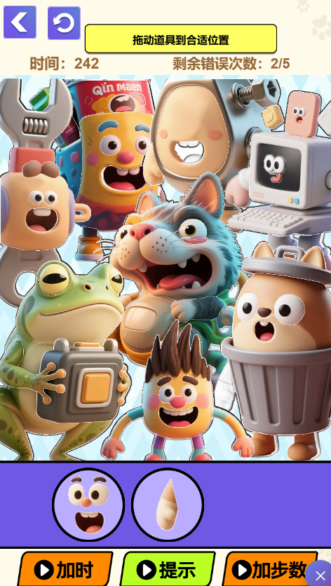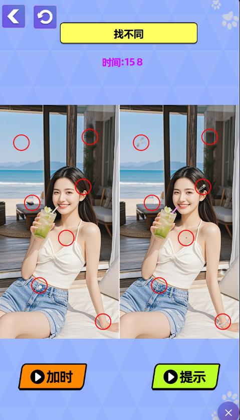 此游戏为休闲益智类游戏,在每一关中,需要你在限定时间内按照游戏要求找出适合它需要的东西,也可能要求你在限定时间内找出两幅图的所有不同之处,操作简单,仅需用鼠标拖拽或左键点击差异点即可。这是一个很考验眼力的游戏,快来挑战一下吧。