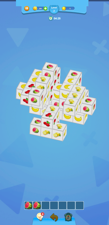 此游戏为休闲消除类游戏,游戏结合了三维视觉效果与经典消除玩法。以水果为主题元素,通过滑动或投掷等方式消除连续三个相同的水果。超多关卡,快来挑战吧。