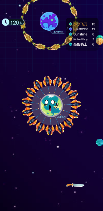 此游戏为竞技生存类游戏,以投掷飞刀为核心玩法,玩家通过控制飞刀投掷方向与力度进行战斗,结合科幻风格画面,适合休闲及竞技场景。