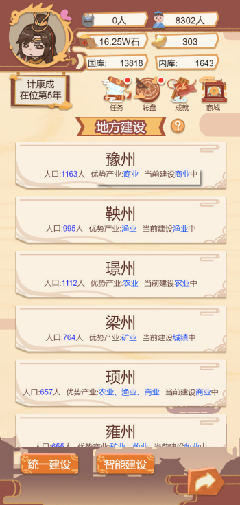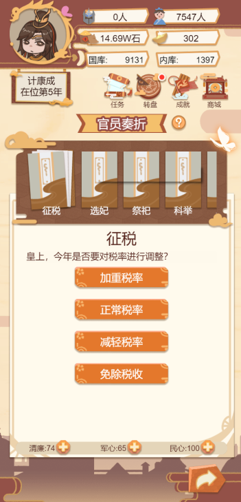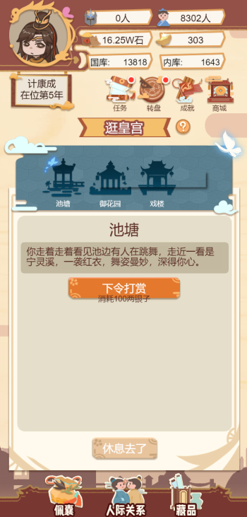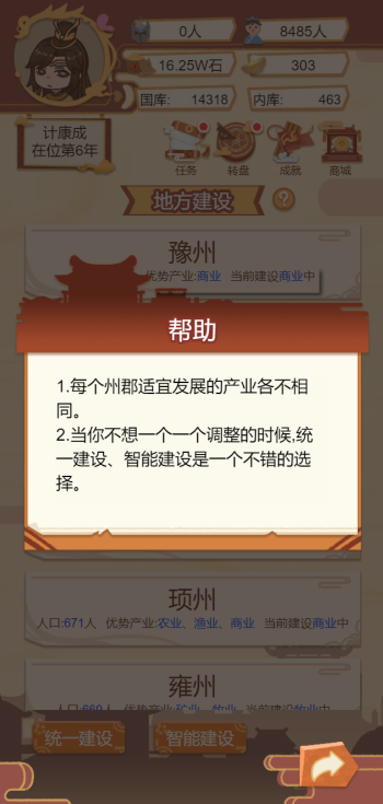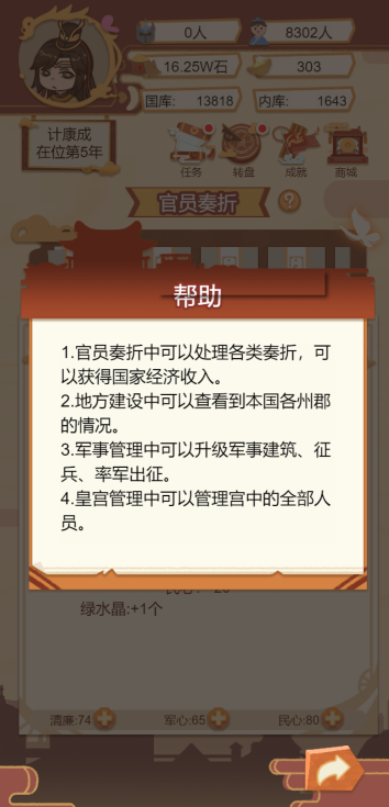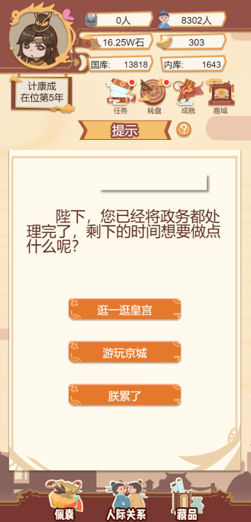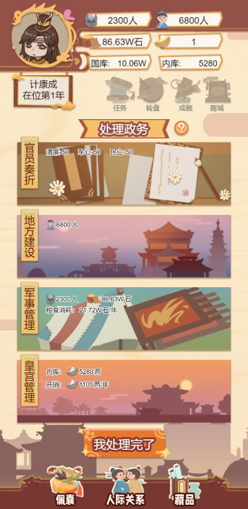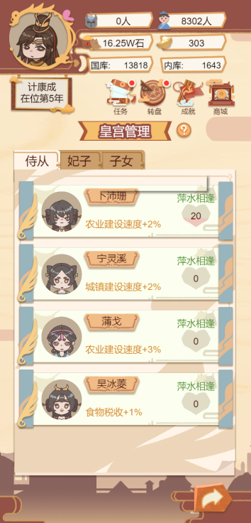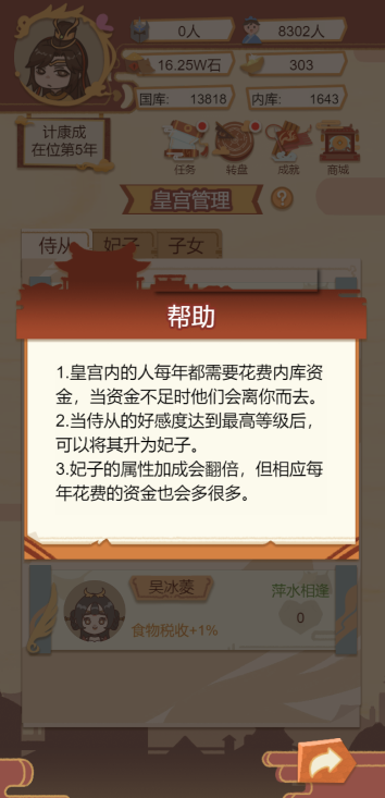 此游戏为模拟经营类游戏,一款以古代帝王生活为背景的模拟经营类手游,玩家通过政治决策、后宫管理、城市建设等玩法,体验权力运作与国家治理的挑战。