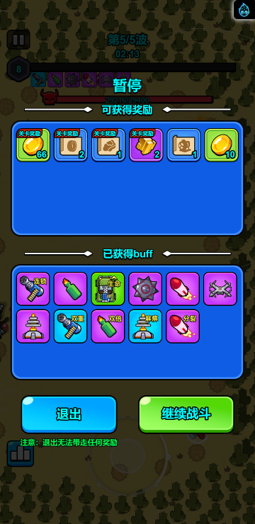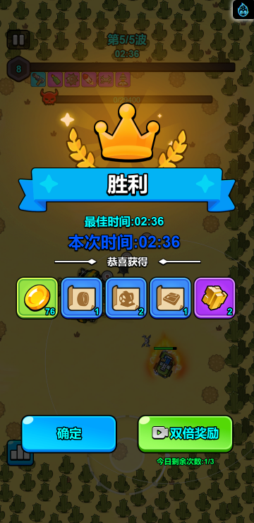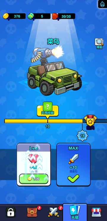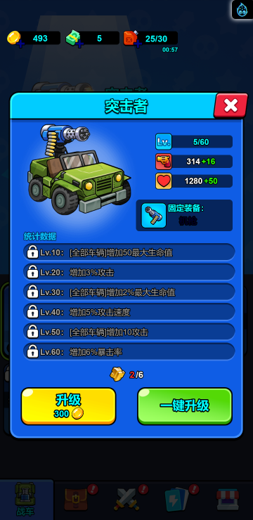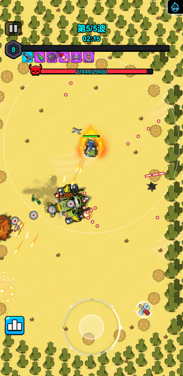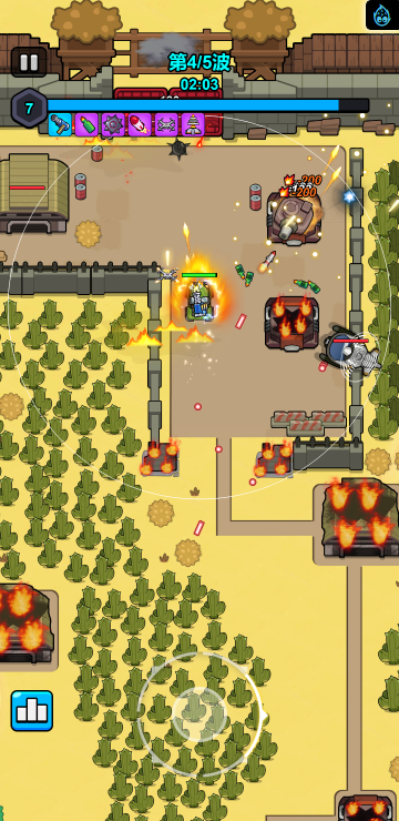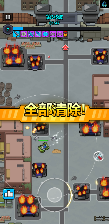 此游戏为塔防战斗类游戏,游戏中你可以操控战车在敌营冲锋陷阵,还要努力躲避敌人的子弹,地图内还有各种道具可以拾取,有无人机、恢复血量等道具,每一关最后关卡都是BOSS,只有消灭它才算通过,努力冲锋吧!