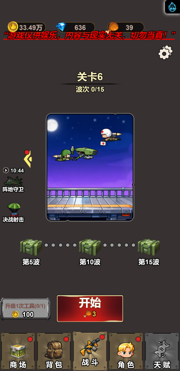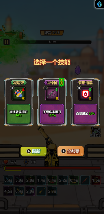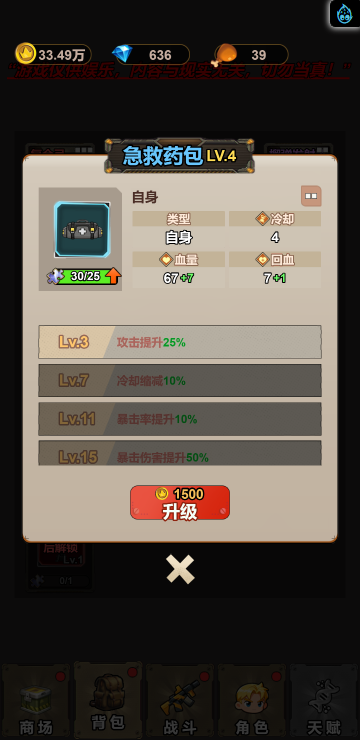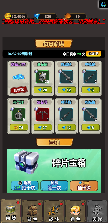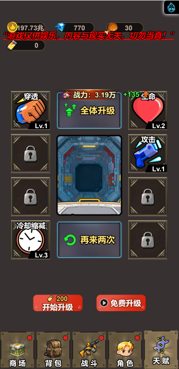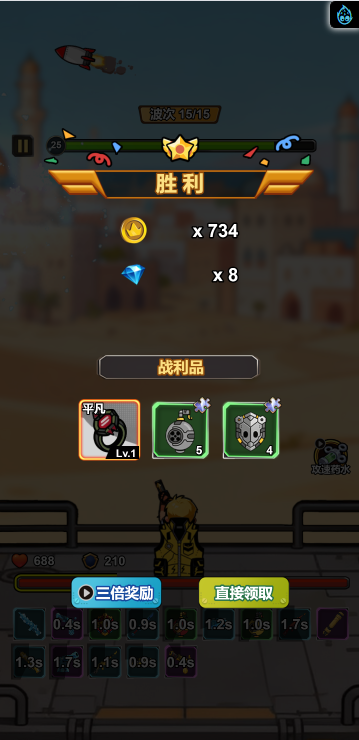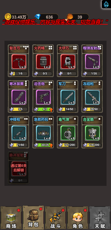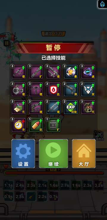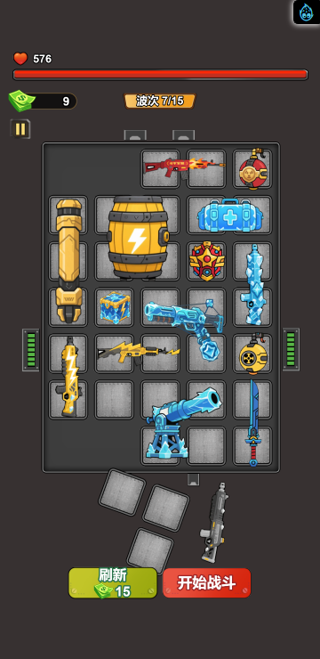 此游戏为塔防战斗类游戏,游戏中你可以通过合成不同的武器来增强自己的实力,战斗中角色会自动攻击,但是要选择适合自己的词条,大幅提高自己的实力才是关键!另外还有其他各种玩法等待挑战!