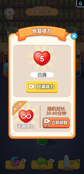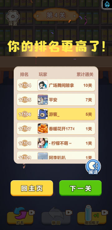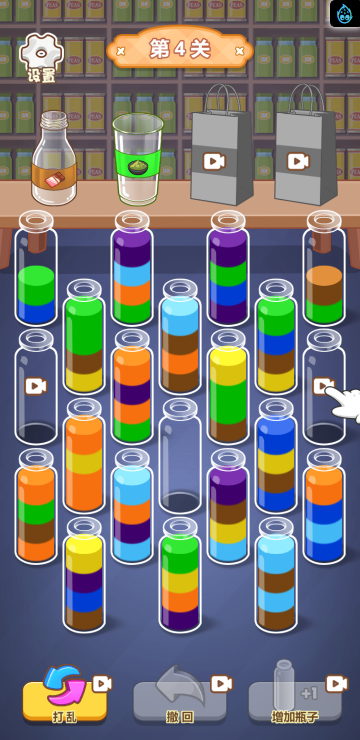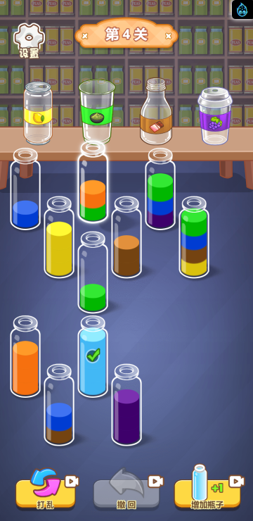 此游戏为消除类游戏,游戏内容很简单,就是倒水消除小游戏,把所有不同颜色的水进行分类,最终把每个关卡都分类消除完成就算通关,如果遇到困难可以使用道具来快速实现消除,多多尝试吧!