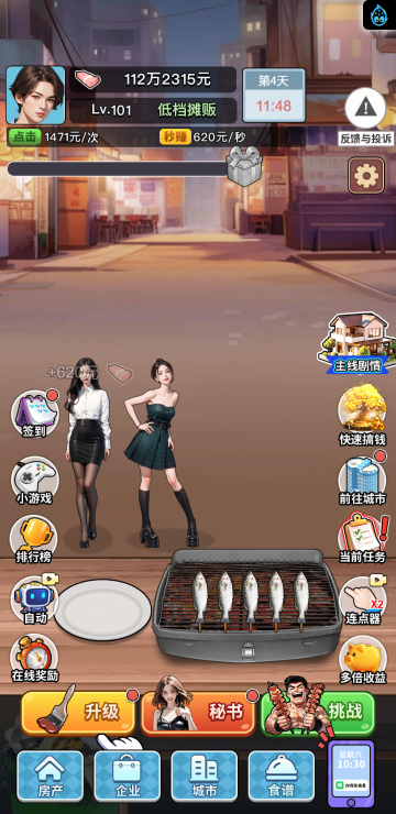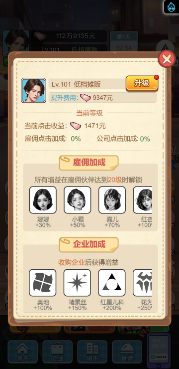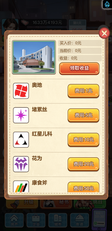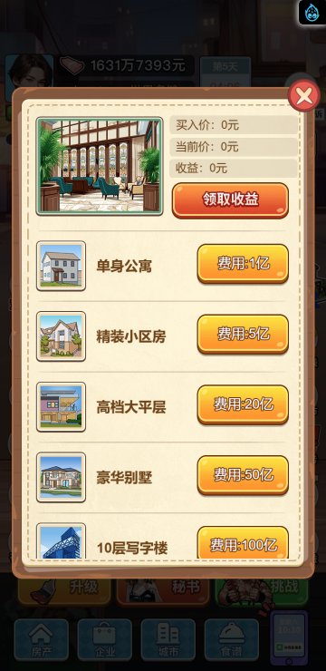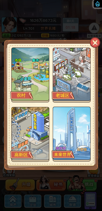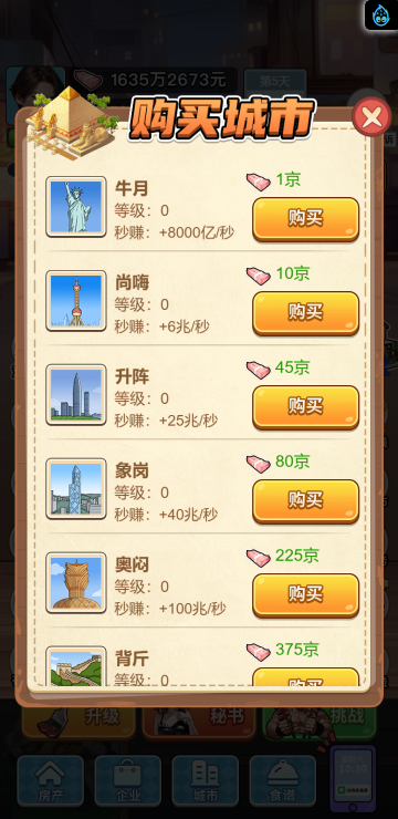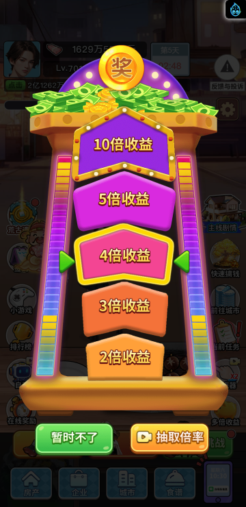 此游戏为模拟经营类游戏,游戏中如果想过上富足的生活,需要努力赚钱,可以通过各种小游戏来获取money,也可以通过赚的钱来购买城市、地域来赚取更多的钱,还可以穿越到古代炼丹锻造来获取更多钱,主要目的就是赚钱!