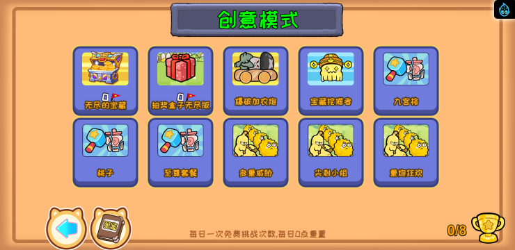 此游戏为休闲塔防类游戏,游戏中有多种游戏模式,比如挑战模式。益智、迷你、生存模式、创意模式等,你可以选择自己喜欢的游戏模式进行体验,但是不同的模式需要一定条件才能解锁,快来试试吧!