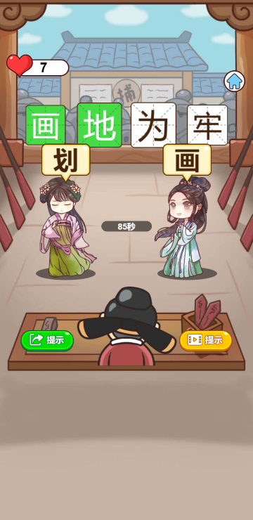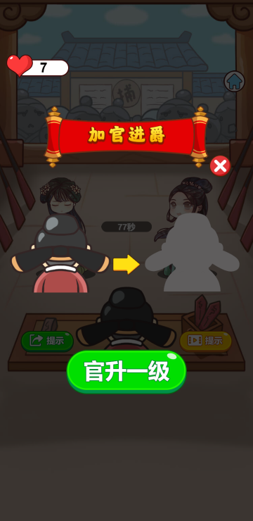 该游戏为成语文字游戏,通过猜对成语来增加经验,以便更好的提升官级,还可以解锁二十四节气,如果没有爱心继续游戏的话,观看视频可以获取更多。