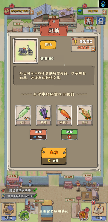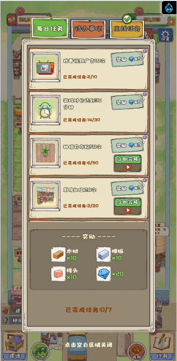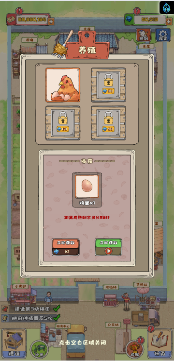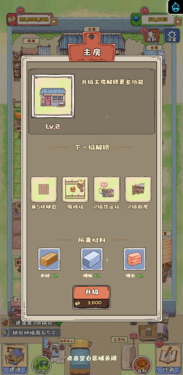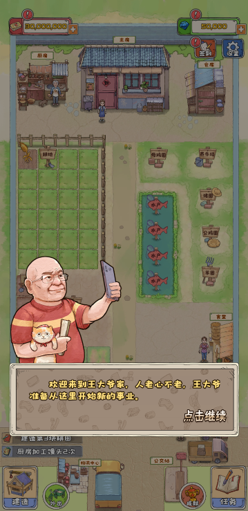 这是一款模拟经营类小游戏,游戏中你经营一个寨子,你可以通过各种方式赚钱,比如种地、加工、饲养、捕鱼、贸易等等,不同的方式需求建筑的等级也不一样,尽可能保证主房拥有更高等级,尽可能多的完成任务,快来试试吧!