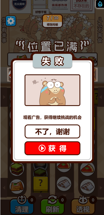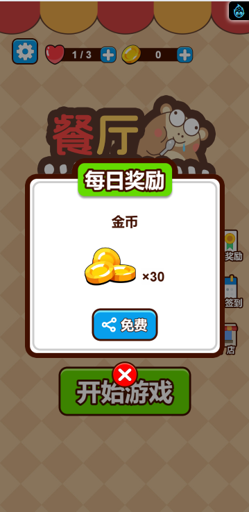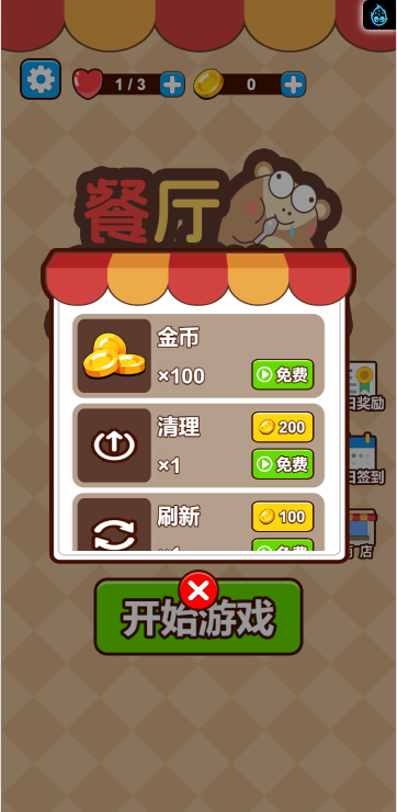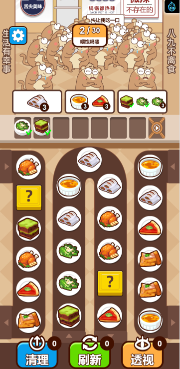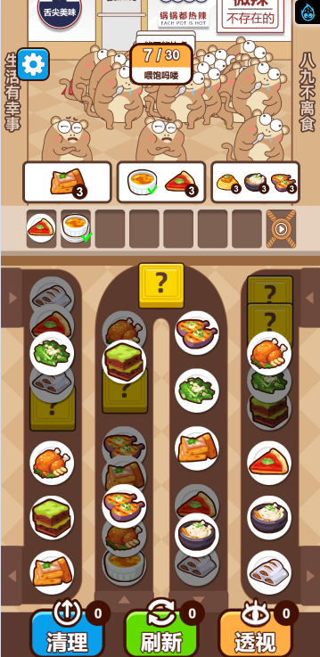 这是一款消除类小游戏,游戏中你将扮演餐厅服务员,为你的吗喽顾客提供不同的餐食,而每种餐食需要三个相同的食物才能合成,每一关都有一定数量的顾客,你需要全部满足他们的需求才算通关,快来试试吧!