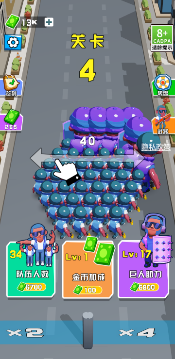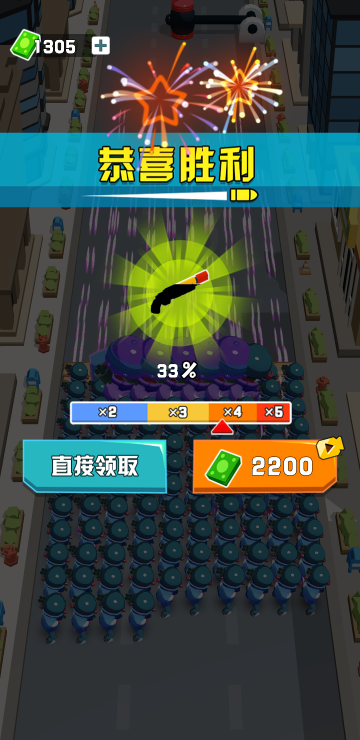 该游戏为大逃亡游戏,在不断逃亡过程中,通过变换方向来拿到适合的BUF,从而改变自己的小兵数量,还要注意躲避路障,当到达终点并全部消灭所有敌人即为胜利。