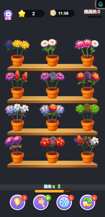 这是一款消除类小游戏,游戏中你变身为插花师,为不同种类的花进行分类,难度也随着关卡逐渐增加,你要合理安排花卉的位置,尽可能快的把隐藏在后面的花朵释放出来,不然越到后面越没有位置来放置它们了,快来试试吧!