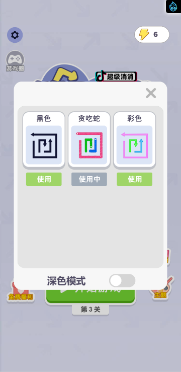 这是一款箭头消除游戏,根据箭头方向无障碍即可消除,还可以切换不同的皮肤。