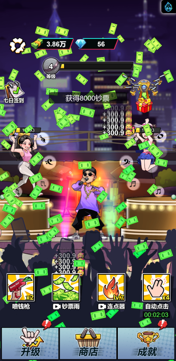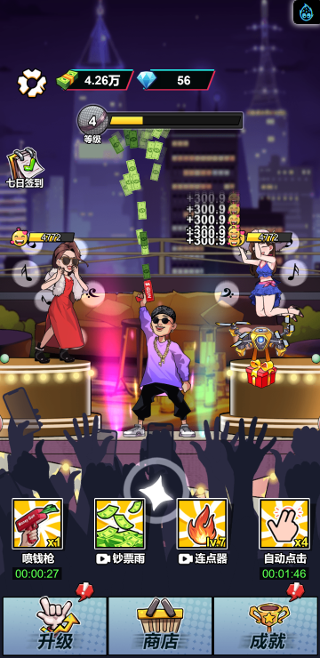 这是一款养成类的游戏,作为主角的你需要通过不断赚钱来升级和解锁,还可以和你的乐队一起渲染气氛。
