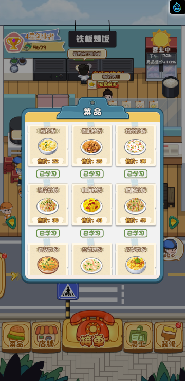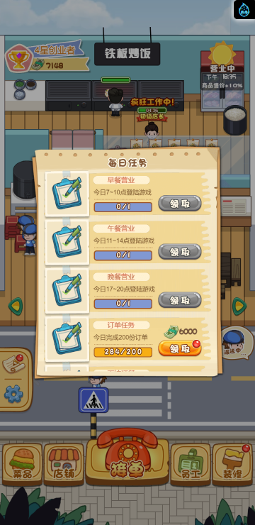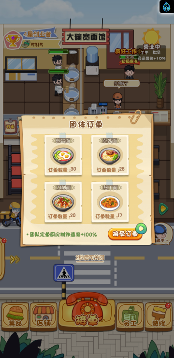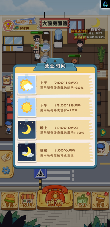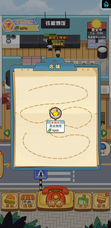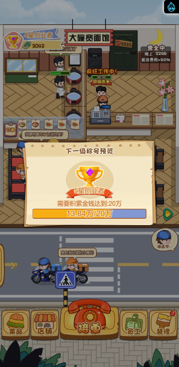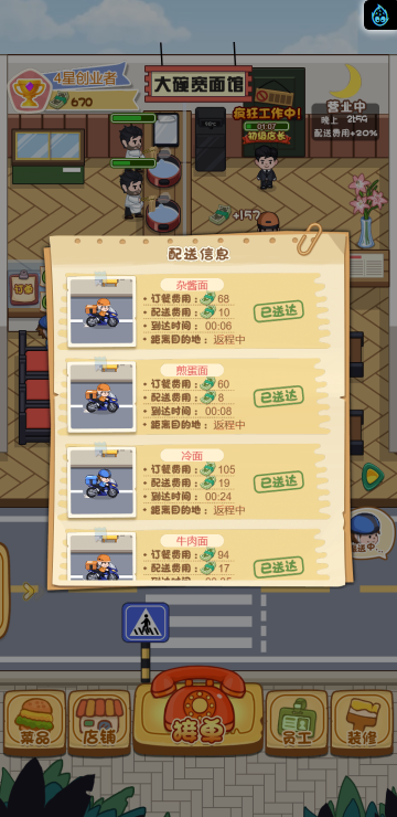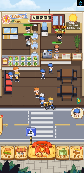 这是一款模拟经营的游戏,你经营多家餐饮店,根据骑手需求提供需要的餐品,达到一定程度可以解锁新的店铺。