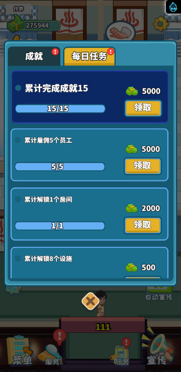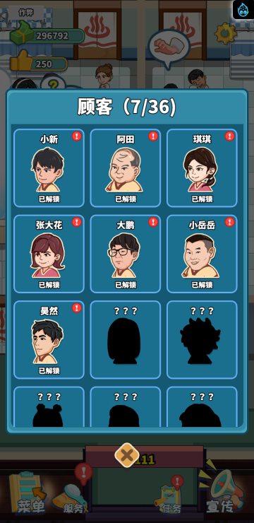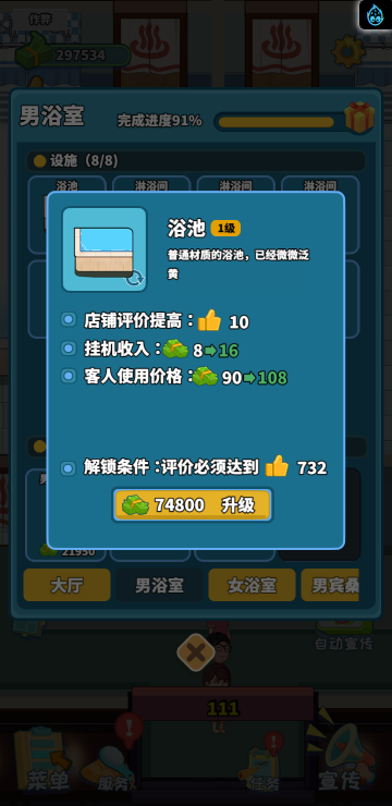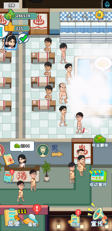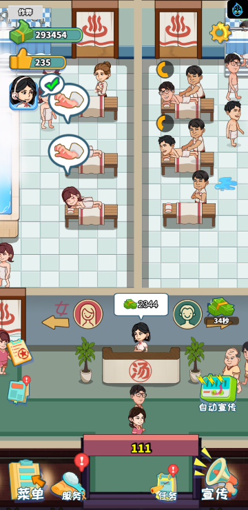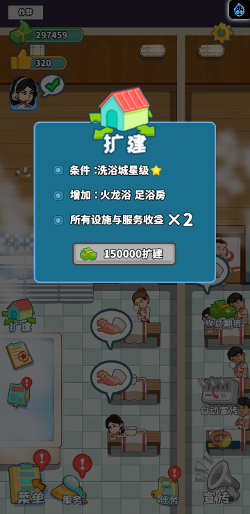 这是一款模拟经营类游戏,你经营着一家洗浴店,通过不断赚钱解锁更多区域和玩法。
