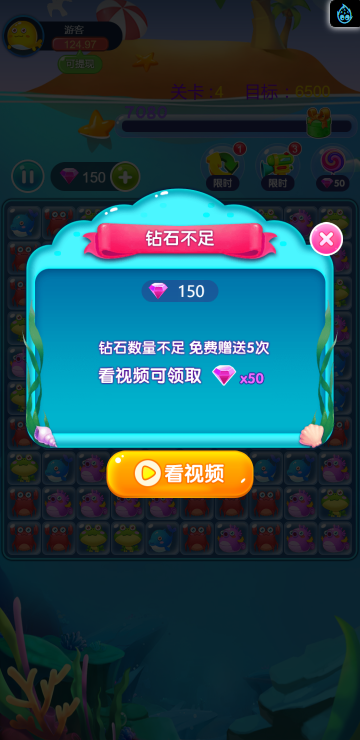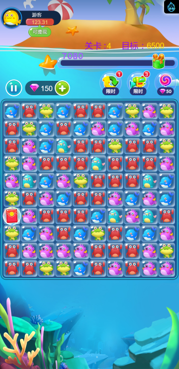 这是一款消除类的游戏,类似消灭星星,多种海洋动物陪你一起炫酷消除。
