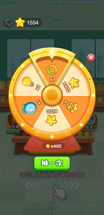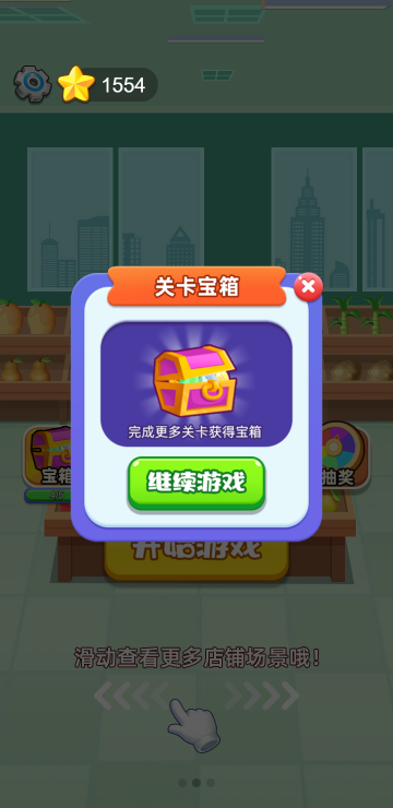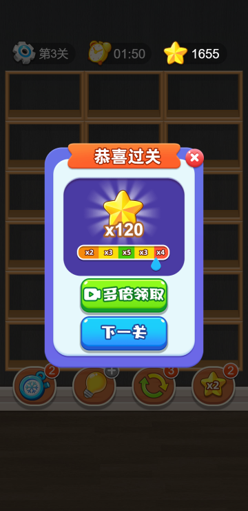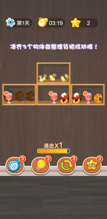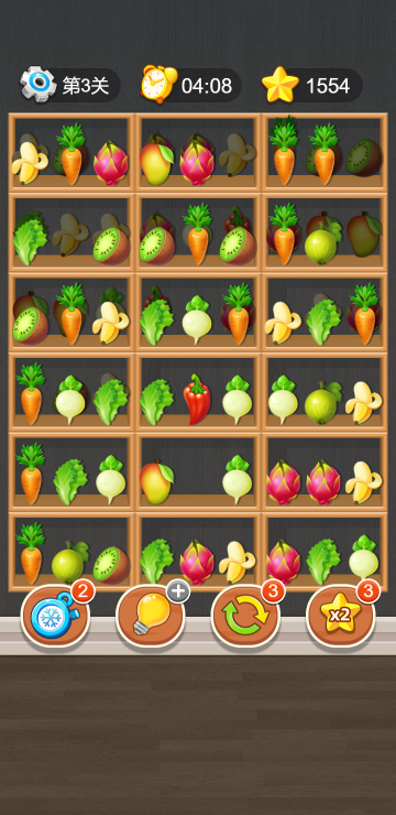 货柜上摆满了物品,根据场景不同可以是水果、蔬菜等,三个一样的物品在同一格子并且处于最前方可见位置即可消除,当所有消除完毕才算通关,每关都有时间限制,连续消除次数越高分数越高哦,共有35关。