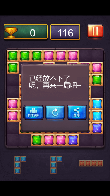 屏幕下方会随机生成不同形状的方块,你需要把它拖到可放区域,当行或列放满即可消除,如果生成的方块不能放进可放区域即游戏结束。