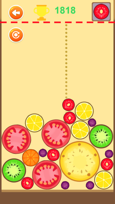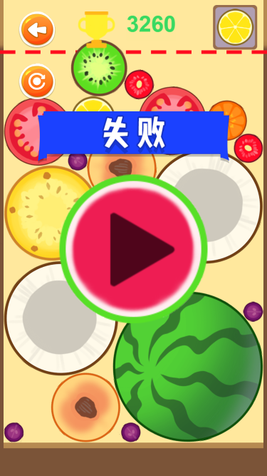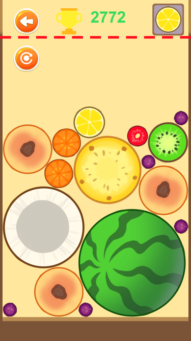该游戏为休闲合成游戏,相同水果可以合成,从小到大,最终可以合成大西瓜。