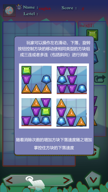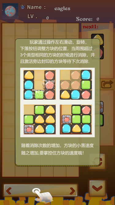 此游戏为休闲消除类游戏,游戏内有三种消除模式:俄罗斯方块、画像方块和宝石方块,各种玩法略有不同,方便好玩,可以通过屏幕滑动来改变方块的位置,不需要左右按键来控制。