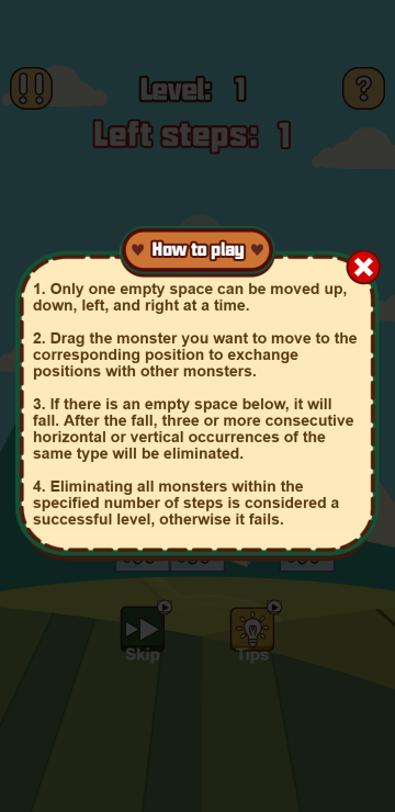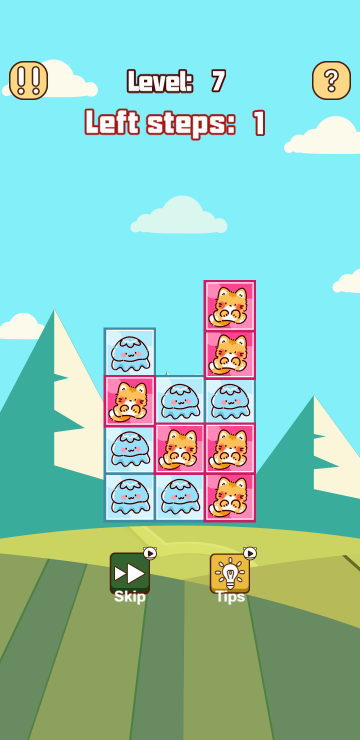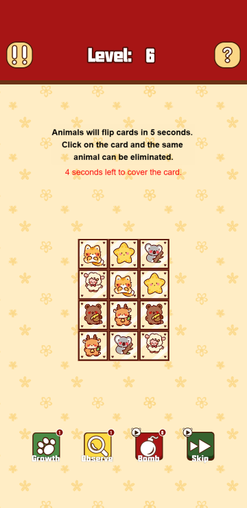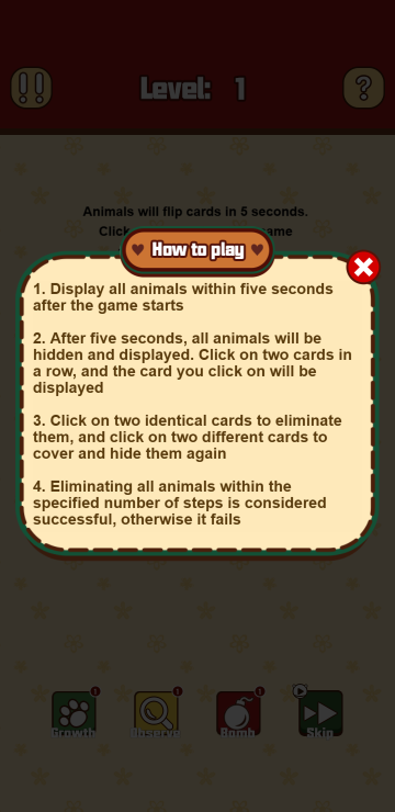 游戏分为两种游戏模式:1、翻牌模式,游戏会在5秒后盖牌,要在5秒内记下动物的摆放,5秒后把动物消除即为胜利;2、移动模式、在有限的步数内,移动动物完成所有动物的消除即为胜利。