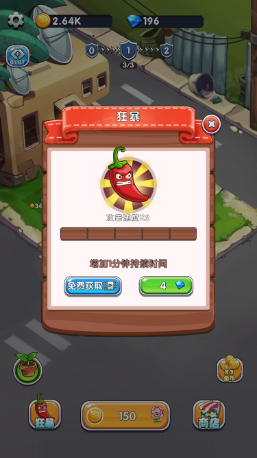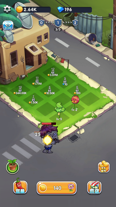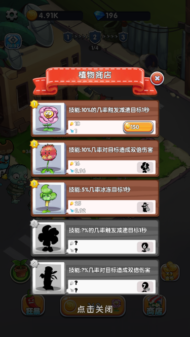 该游戏为打僵尸游戏,同一种花朵可以合成升级为高一级花朵,升级后威力也更强,只有成功阻止僵尸达到终点才能取得胜利,还可以通过视频解锁更多空间来种植花朵,后期压力还是很大的。