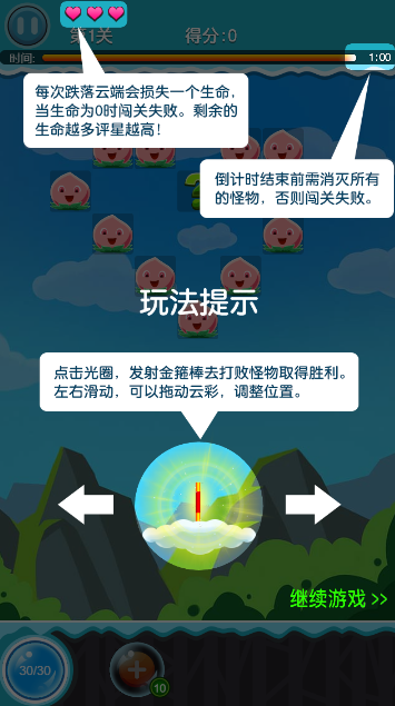 使用金箍棒击打怪兽,在合理使用掉落的道具的情况下,尽快消灭所有怪兽,认真查看道具说明有助于提升游戏体验哦,并且游戏是有时间限制的,动作一定要快!