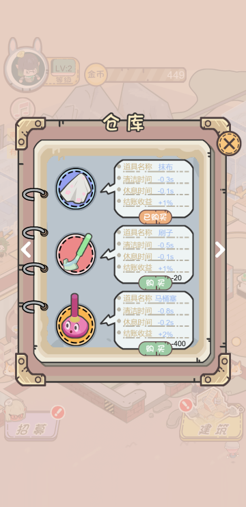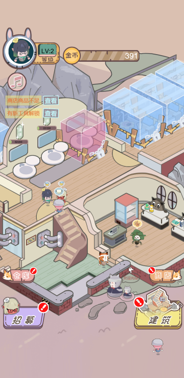 此游戏为模拟经营类游戏,游戏中你可以通过建造或者升级设施来满足客人需求,设施是随着人物等级的提升不断解锁,你还需要经常为客人打扫卫生,当然,如果不想自己动手的话,也可以通过招募人手来帮你完成。
